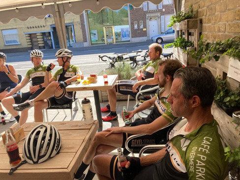 Eric gaf het commando over; hij had deze week teveel ‘krachttraining’ gedaan tijdens de zware verbouwingswerken bij Thibaut. Peter Siau en Peter ‘Ventoux’ Cooreman nemen over. Die zaten nog goed fris want het tempo moest wat getemperd worden. In stevige draf naar Uitbergen, vanaf de Veerstraat-Molenstraat werden nog de laatste cartouches verschoten om met net geen 100km bij Denny op het zonnig terras te genieten.
