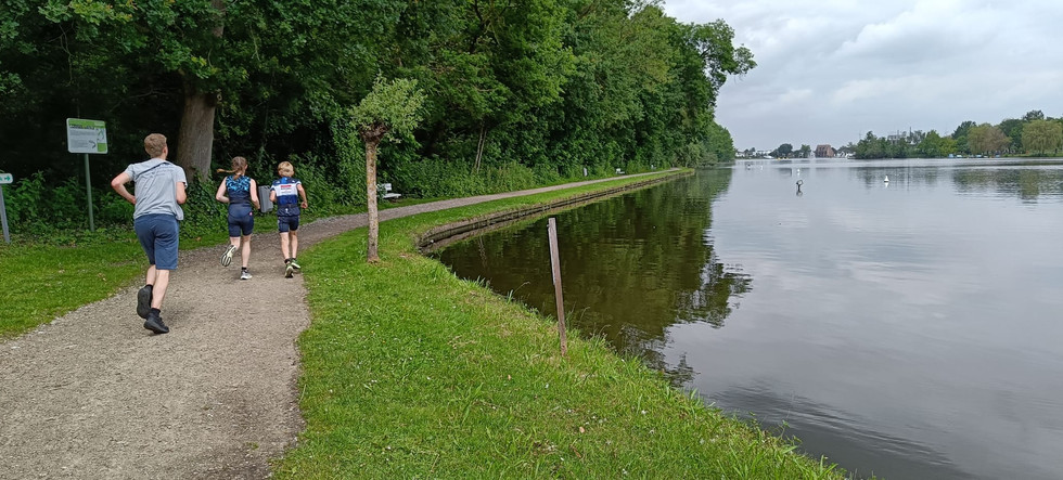 Sportdag vandaag rond het Donkmeer met de Donktriatlon, en voor de eerste keer een kids versie. 't Stuurken was gevraagd om begeleiding te voorzien tijdens het fietsen, en als het even kon ook tijdens het lopen. Tuurlijk kan dat. Al werd in de loop van de week toch besloten bij de eersten een moto te plaatsen, want die kunnen een eindje fietsen.