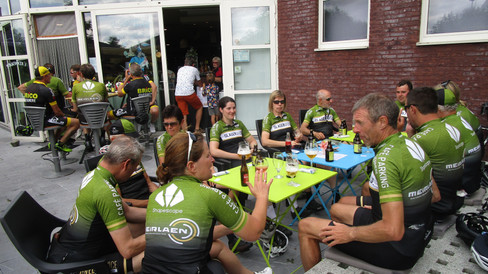 Via Grembergen houden we na 37 km halt in Café Turfput, net terug geopend met nieuwe uitbaters. Goede locatie voor Gerard, net naast zijn deur ! De ogen van Theo & Odilon blinken ook bij de verschijning van de uitbaatster :-) Er worden moppen verteld; de sfeer zit opperbest ! Daarna naar de sporthal met 50 km op de teller. Een gezellige sfeer onder de beide clubs.